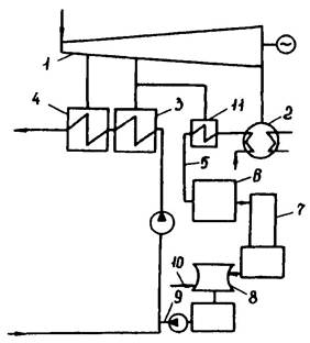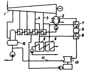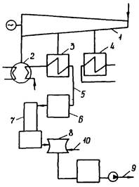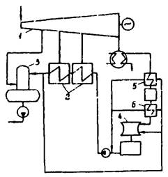1 - турбина; 2 - сетевые подогреватели; 3 - деаэратор повышенного давления; 4 - вакуумный деаэратор; 5 и 6 подогреватели исходной и обессоленной воды