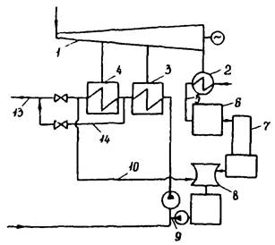 13 - подающий сетевой трубопровод; 14 - байпас верхнего сетевого подогревателя. Остальные обозначения см. рис. 1