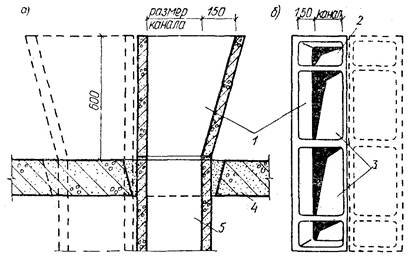 4.3. Оголовки вентиляционных блоков имеют вид прямоугольного короба и изготавливаются, как правило, из бетона (рис. 2). Отверстие в нижней части оголовка совпадает с размерами вентиляционного блока, в верхней части оно расширяется на 0,15 м (в одну сторону, для удобства компоновки блоков). Высоту оголовка следует принимать 0,6 м от перекрытия, чтобы выброс воздуха происходил в среднюю зону чердака. Толщина бетонных стенок должна быть минимальной.