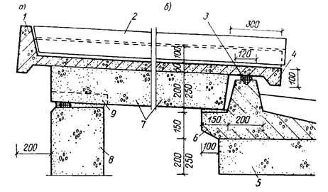 поперечное сечение; б - вид сверху; 1 - бетонный оголовок;