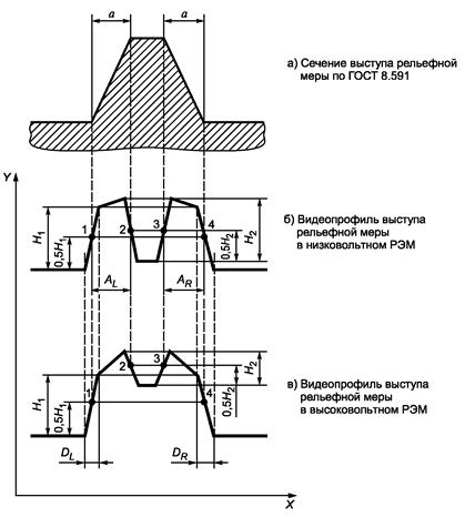 Примечание - Значение электронно-оптического увеличения РЭМ должно обеспечивать получение изображений, которые позволяют определить значения параметров, приведенных на рисунке 1 б) и в). При этом значения проекций наклонных стенок выступа АL и Ar, измеренных по видеопрофилю, должны быть не менее 200 пикселей.
