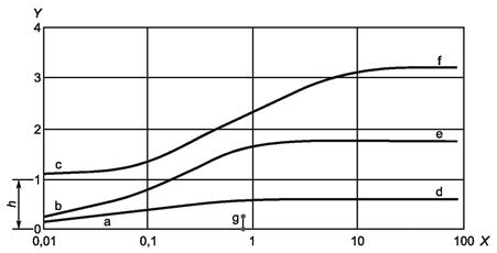 X - отношение жесткости подшипникового узла к жесткости ротора; Y - отношение критической частоты вращения к рабочей частоте вращения; а - 1-я форма собственных колебаний жесткого ротора; b - 2-я форма собственных колебаний жесткого ротора; с - 1-я мода изгибных колебаний (низкая жесткость опоры); d - 1-я мода изгибных колебаний (высокая жесткость опоры); е - 2-я мода изгибных колебаний; f - 3-я мода изгибных колебаний; g - жесткость масляного слоя подшипника; h - рабочий диапазон частот вращения