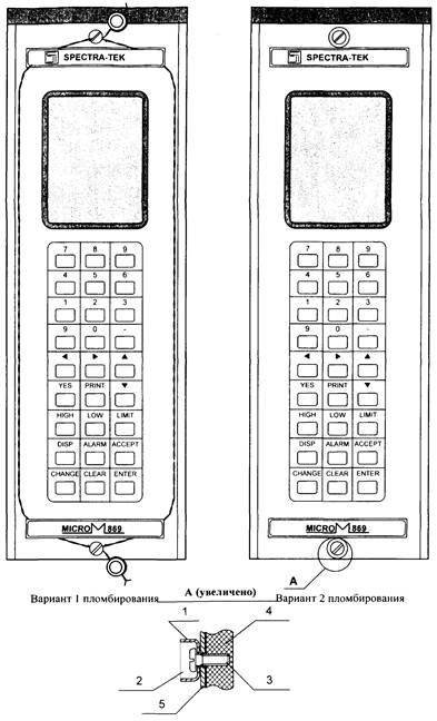 1 - шайба чашеобразная М5; 2 - мастика для оттиска клейма; 3 - винт М4; 4 - передняя панель; 5 - корпус прибора.