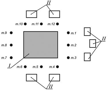 Если имеется 12 точек измерений, то их располагают по три вдоль каждой стороны по краям и по середине стороны в соответствии с рисунком 1.