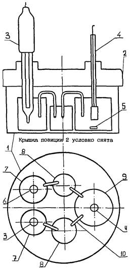 1 - корпус ячейки; 2 - крышка ячейки; 3 - электрод сравнения ЭВЛ-1М3; 4 - электрод рабочий; 5 - перемешивающий элемент; 6 - электрод вспомогательный; 7, 8 - вспомогательные стаканчики; 9 - кварцевый электролизер; 10 - электролитические мостики