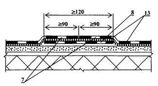 Дополнительный водоизоляционный ковер - слой или слои из рулонных материалов, выполняемые для усиления основного водоизоляционного ковра в ендовах, на карнизных участках, в местах примыкания к парапетам, стенам, шахтам и другим конструктивным элементам.