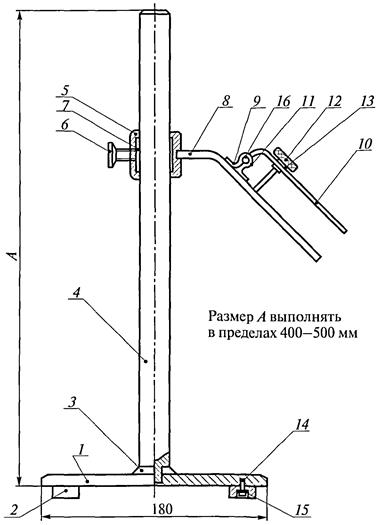 стержня 10, на котором крепятся индикатор и источник нагрева, а также рычажный механизм с опорной и измерительной площадками и нагрузочным приспособлением;