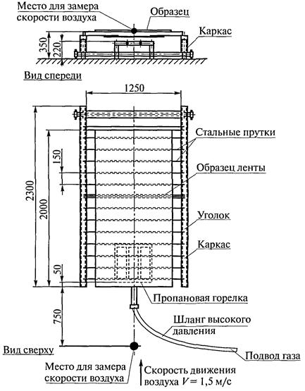 б) при проведении испытаний тканевых и тросовых лент по методике, изложенной в приложении Е, после прекращения воздействия пламени мощного рассредоточенного по площади источника тепла (пропановая решетка) при наличии воздушного потока должен оставаться целый по ширине образца (неповрежденный пламенем) участок ленты.