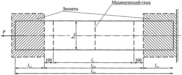 Для испытаний разъемных соединений используют образец шириной 150 мм и длиной 200 мм; для испытаний неразъемных соединений - шириной 200 мм и длиной, равной длине стыка плюс по 200 мм с каждой стороны стыкового соединения плюс две длины захвата в зажимном устройстве (рис. 1).