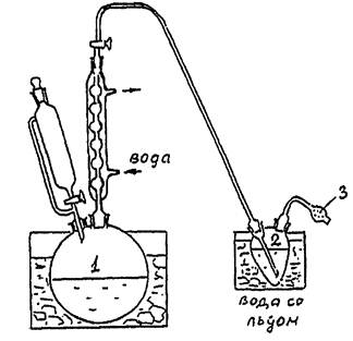 В круглодонную колбу вместимостью 100 см3 (рис. 1), снабженную капельной воронкой с байпасом и обратным холодильником, помещают 12 г (0,2 моля) KОН, 6 см3 метилового спирта, 6 см3 или 6,1 г (0,12 моля) гидразин-гидрата. Колбу охлаждают до +5 °С смесью воды со льдом и начинают медленно, по каплям прибавлять из капельной воронки 10 см3 (0,12 моля) хлороформа, постепенно увеличивая скорость. При этом реакционная масса становится желтой.