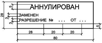 Г.3. Штамп «АННУЛИРОВАН, ЗАМЕНЕН ... № ... от ... г.» ставят (с указанием номера, даты регистрации разрешения на внесения изменений и подписи) на аннулированных подлинниках, дубликатах и копиях, а также на карточках учета проектных документов. При отсутствии замены ставят прочерк. Форма штампа приведена на рисунке Г.2.