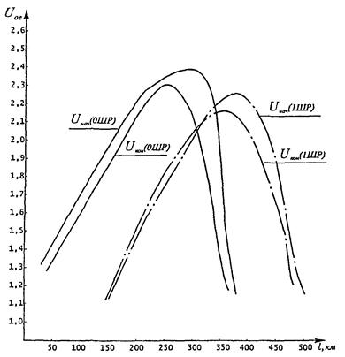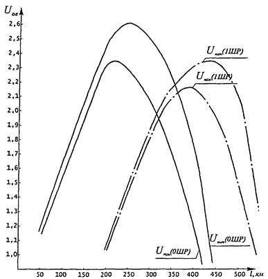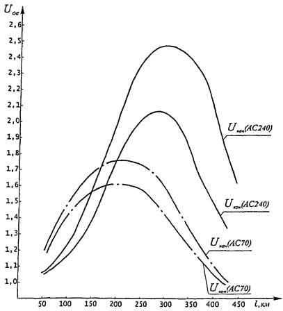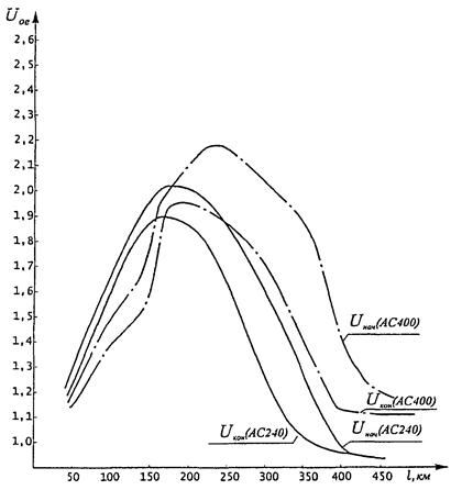 - в послеаварийных режимах питания тупиковых ПС с резистивной нагрузкой (осветительной, нагревательной и т.п.) меньше 0,1 от натуральной мощности (Рнат), передаваемой по питающей линии длиной 180 - 350 км. Натуральную мощность линии определяют по формуле: