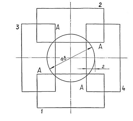 Для исключения влияния отклонения от параллельности измерительных поверхностей концевых мер их устанавливают между измерительными поверхностями скобы одним и тем же краем А. Отклонение от параллельности измерительных поверхностей скобы определяют как наибольшую разность показаний отсчетного устройства при четырех положениях меры.