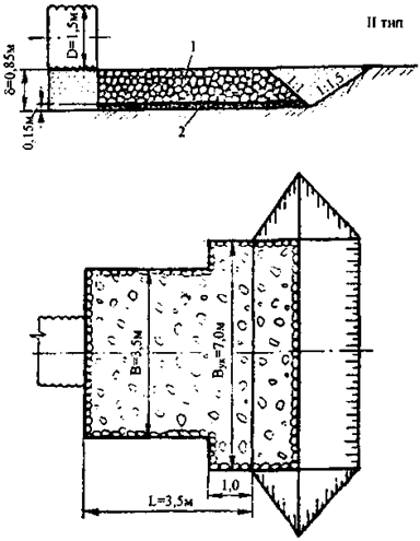 Рис. М.2. Пример проектирования армогрунтовой обоймы, противофильтрационного экрана (геомембраны), входного и выходного оголовка и рассеивающего валика для МГТ на рис. М.1