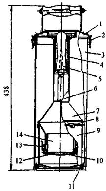 1 - верхняя крышка; 2 - замок; 3 - футляр; 4 - насадка; 5 - нож; 6 - трубка; 7 - поплавок; 8 - крючки; 9 - сосуд; 10 - тарировочный груз; 11 - резиновое кольцо; 12 - нижняя крышка; 13 - замок; 14 - режущий цилиндр