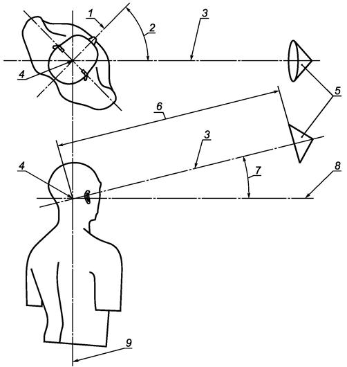 3.3 расположение субъекта при испытании (subject test position): Расположение прямо сидящего субъекта с поднятой головой так, чтобы его контрольная точка располагалась на контрольной оси на рабочем расстоянии.