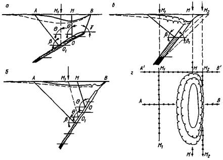 а - при пологом и наклонном падении; б, в - при крутом падении; г - на плане земной поверхности