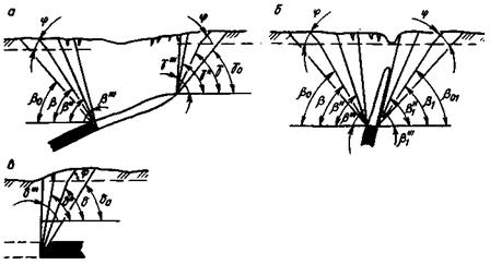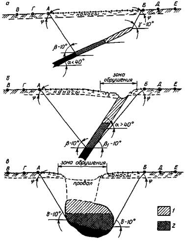 2.10. Длины профильных линий определяют следующим образом (рис. 2). При пологом и наклонном падении рудных тел (a < 45°) на разрезе вкрест простирания от нижней границы очистной выработки, проектируемой к отработке под профильной линией, проводят линию под углом b - 10°, а от верхней границы выработки - под углом g - 10° до контакта коренных пород с наносами (точки на рис. 2, а) и далее - под углом j до пересечения с линией земной поверхности в точках А и Б. Полученные точки А и Б дают границы ожидаемой зоны сдвижений земной поверхности, а расстояние между ними определяет длину рабочей части профильной линии вкрест простирания на данном разрезе.