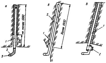б) при угле падения рудного тела более 45° закладывают две профильные линии, одну из которых располагают над серединой очистной выработки первого отрабатываемого этажа (q = 90°), а другую - над нижней границей проектных очистных выработок на период наблюдений (см. рис. 1, в).