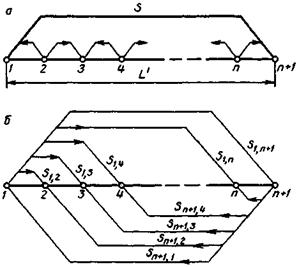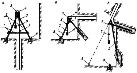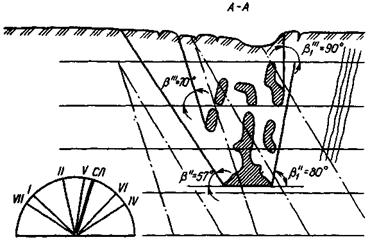 а) при разработке рудных тел малой и средней мощности (m < 5 м) преимущественно жильного типа положение основной профильной линии по простиранию определяют по углу q = 90°, построенному от середины общего выработанного пространства (см. рис. 1, б);
