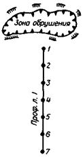 При наличии на участке наблюдательной станции зоны обрушения или возможности образования такой зоны профильные линии должны состоять из двух отрезков, заложенных от фактической границы зоны обрушения или от границы ожидаемого провала в стороны висячего и лежачего боков рудных тел. Отрезки профильной линии, закладываемые на противоположных сторонах зоны обрушения, располагают, как правило, в одной вертикальной плоскости. При существенном различии в характере процесса сдвижения пород лежачего и висячего боков можно закладывать дополнительные профильные линии.