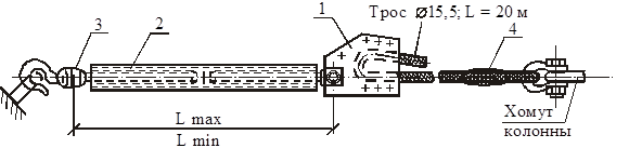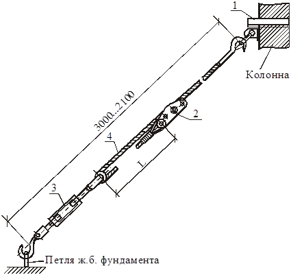 1 - клиновый зажим; 2 - резьбовая стяжка; 3 - тяга с крюком; 4 - трос со скобой