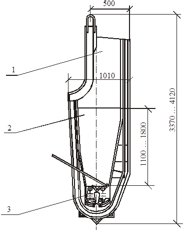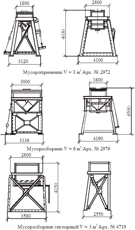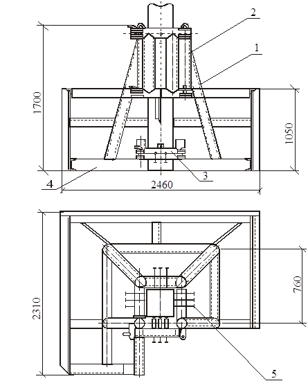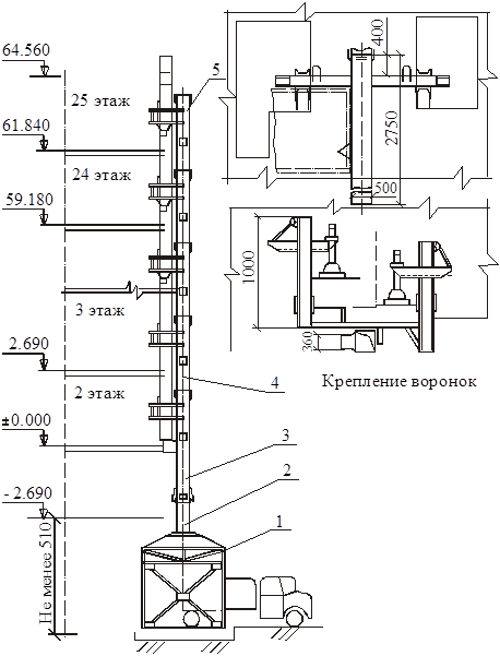 1 - мусороприемник; 2 - воронка прямая; 3 - воронка левая; 4 - воронка правая; 5 - крепление мусоропровода.