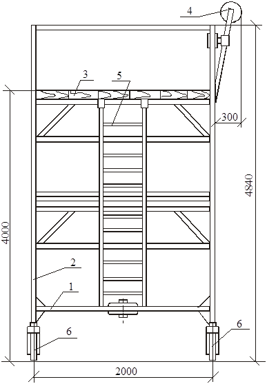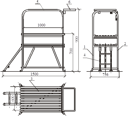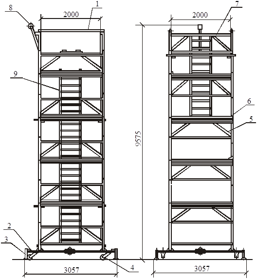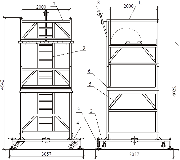 Состоит из каркаса (1), кассет (2-4). Для удобства передвижения контейнер установлен на колеса (3, 6, 7). Длинномерный инструмент хранится в футлярах (8).