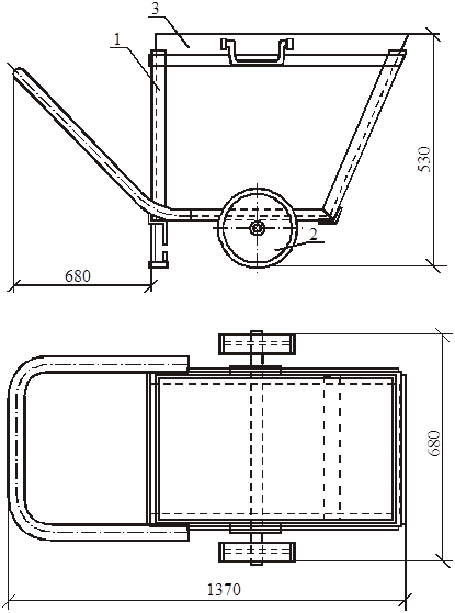 Состоит из тележки (1), двух колес (2) и съемного кузова (3).