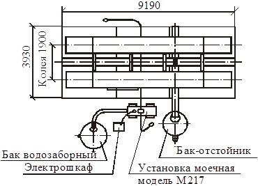 Установка городская для мойки колес автотранспорта представляет собой сборно-разборную эстакаду (1), состоящую из плиты дорожной (2), желоба сливного продольного (3) и желоба сливного поперечного (4) с баком водозаборным (5) и двумя баками-отстойниками (6, 7) и оснащена покупными установками: моечной модели М217 (8) и оборотного водоснабжения «Автосток» (9), а также электрошкафа (10) и шланга моечного (11).