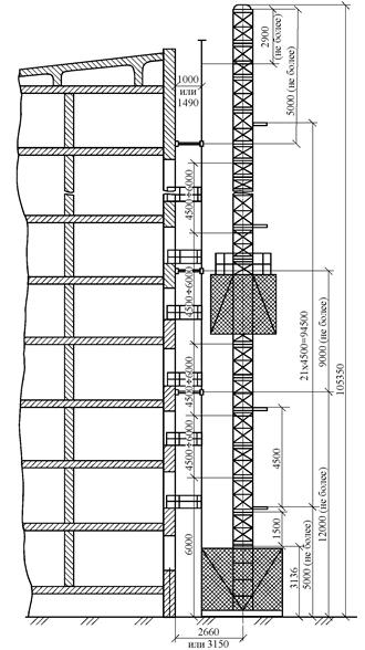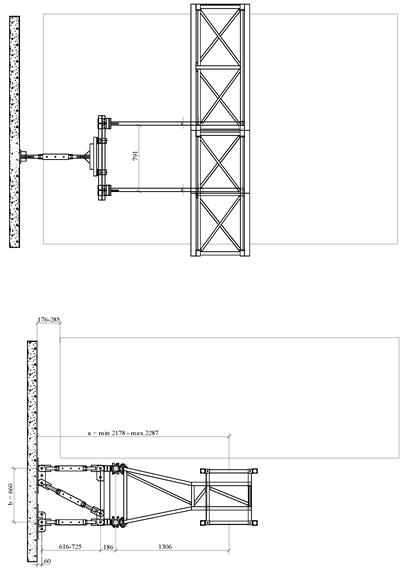 Настенные опоры устанавливают с определенным шагом в соответствии с требованиями «Инструкции по монтажу» и «Руководства по эксплуатации подъемника». Возможность крепления подъемника к зданию должна быть подтверждена проектной организацией. Для раскрепления консольных участков мачты, возвышающихся над крышей, устанавливают жесткие подкосы либо гибкие растяжки из стального каната.