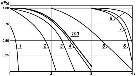 А.12. Кривая зависимости Ki(i), нанесенная на серию тарировочных кривых, приведена на рисунке А.2 (жирная линия 100).