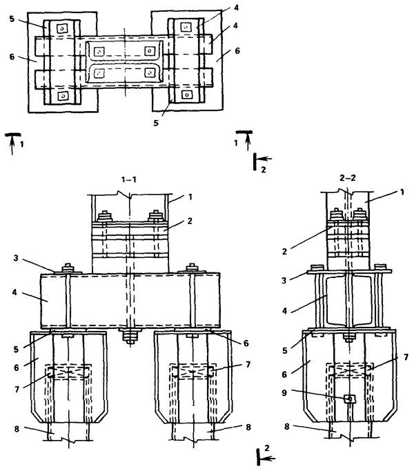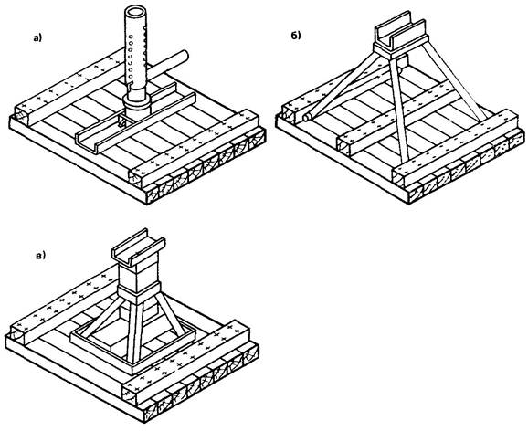 Инвентарные незаглубленные фундаменты проектируются при вертикальной нагрузке N £ 100 кН, как правило, из деревометаллических или металлических элементов, а при N > 100 кН - из железобетонных или металложелезобетонных элементов заводского изготовления (рис. 7). Инвентарные сваи изготавливаются стальными (прил. 2). При проектировании свайных фундаментов, заглубляемых в вечномерзлые грунты, рекомендуется отдавать предпочтение деревянным и инвентарным стальным сваям.