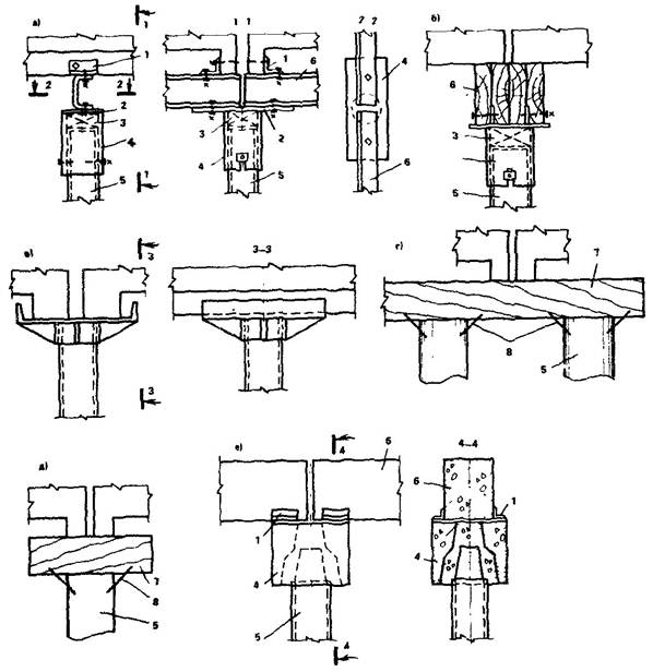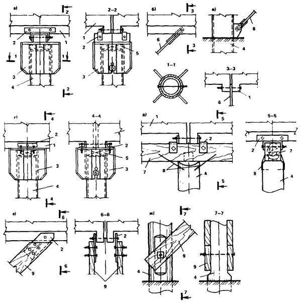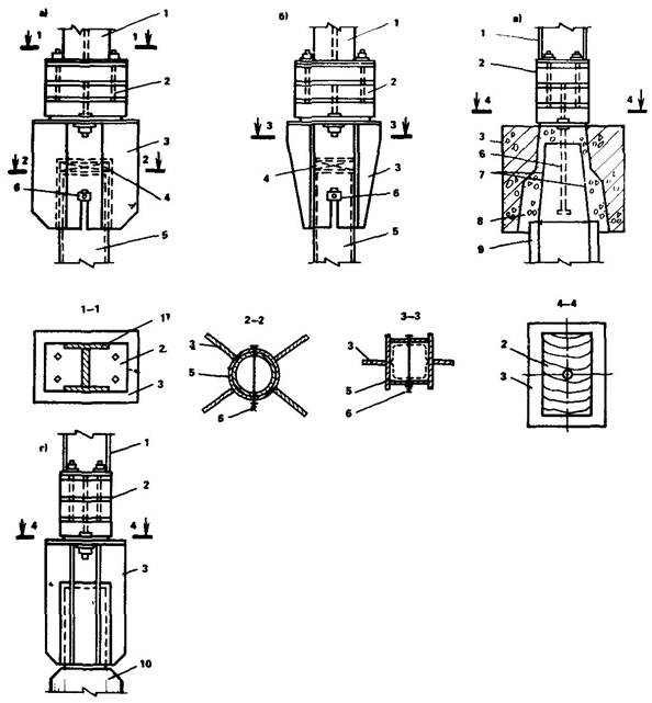 а, в - стаканного типа; б, г, д - столбчатого типа; 1 - колонна (стойка); 2 - фундамент стаканного типа; 3 - заполнение бетоном; 4 - стальной опорный лист; 5 - фундамент с анкерными болтами; 6 - анкерные болты; 7 - сборный ростверк; 8 - сваи; 9 - закладная деталь; 10 - крепежные болты; 11 - стальная накладка; 12 - деревянный составной элемент каркаса