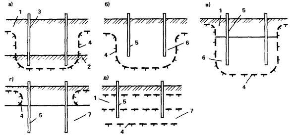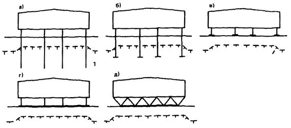 а - плоская плита; б - ребристая плита; в - ряжевый фундамент; г - лежневый фундамент; д, е - железобетонные балочные фундаменты; 1 - плита; 2 - арматурная сетка; 3 - гидроизоляция; 4 - песчаная или бетонная подготовка; 5 - арматурный каркас