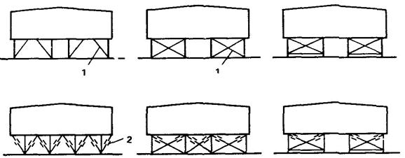 а, д - столбчатые из бетонных (железобетонных) элементов или кирпича; б - в виде деревянной клетки; в, г - из перекрестных деревянных балок; 1 - здание; 2 - подкладка; 3 - балка; 4 - нагели; 5 - песчаная подсыпка толщиной не менее 10 см; 6 - стальные скобы