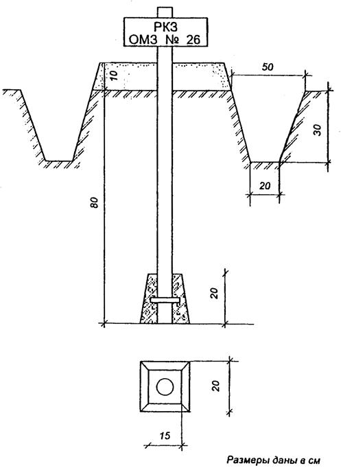 - железная труба диаметром 35 - 60 мм, отрезки рельса или уголкового железа 50 × 50 × 5 мм, 35 × 35 × 4 мм длиной 100 см с бетонным якорем в виде усеченной четырехгранной пирамиды с нижним основанием 20 × 20 см, верхним - 15 × 15 см и высотой 20 см. К верхней части трубы (рельса, уголка) приваривается металлическая пластинка для надписи, внизу металлические стержни (крестовина);