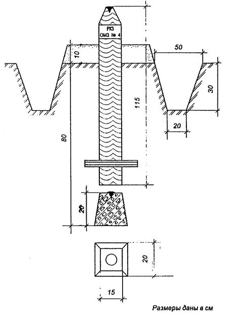 - бетонный монолит в виде усеченной четырехгранной пирамиды с нижним основанием 15 × 15 см, верхним 10 × 10 см и высотой 90 см с заделанным в него кованым гвоздем;