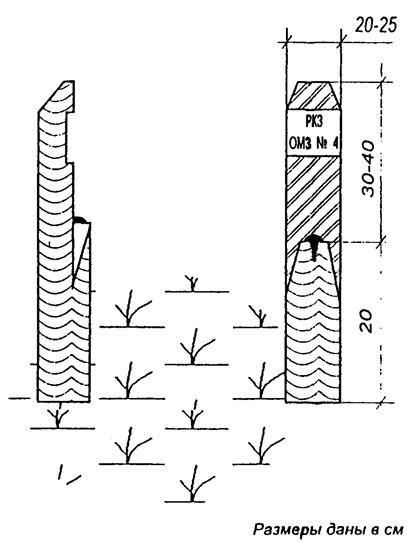 4.6. В качестве межевых знаков используют деревянные колья высотой 75 - 80 см, диаметром 5 - 7 см, железные штыри и трубы, забитые в грунт на 0,4 - 0,6 м.