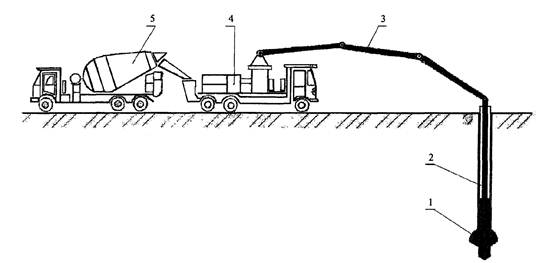 Бетонная смесь 1 поступает в скважину, оборудованную обсадной трубой 2, по бетоноводу 3 от бетононасоса 4, загрузка которого осуществляется автобетоносмесителем 5.
