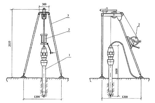 На месте проходки скважины устанавливают на треноге 3 пневмопробойник 1 с лебедкой 2 (рис. 3). Ось пневмопробойника должна быть при этом совмещена с осью будущей скважины.