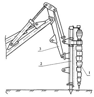 На рис. 5 показан раскатчик 1, направляющая обойма 2, которая навешена на рабочее оборудование экскаватора 3.