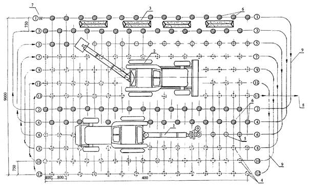 Экскаватор с раскатчиком 1 и экскаватор с ковшом вместимостью 0,25 м3 2 совершают проходки от начала 7 до окончания 8 работ по направлениям 9, указанным стрелками. Очередность проходок установлена цифрами в кружках от 1 до 13. Экскаватор черпает песок из отвалов 3. Проектируемые (размеченные) скважины, скважины раскатываемые и готовые, раскатанные и засыпанные экскаватором скважины, обозначены, соответственно 4, 5 и 6.