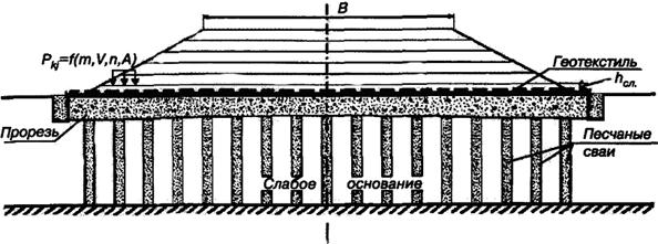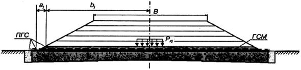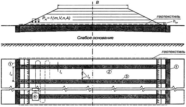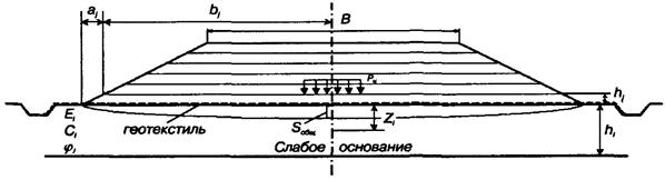 Насыпь на слабом основании следует рассматривать как сложную конструкцию, в которой под нагрузкой взаимодействуют элементы основания (слои грунтов, дренажные и водоотводные сооружения, геосинтетический материал); насыпи (грунтовый массив, армированный ГСМ) и дополнительные удерживающие сооружения.