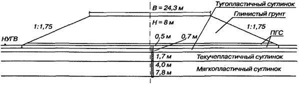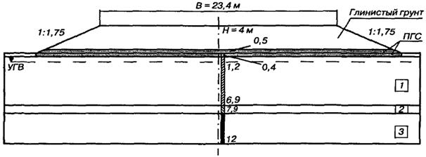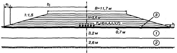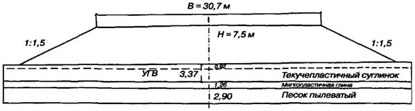 а) проектные характеристики насыпи и основания (высота, ширина, заложение откосов);