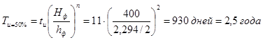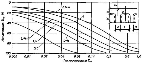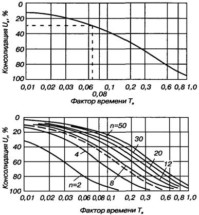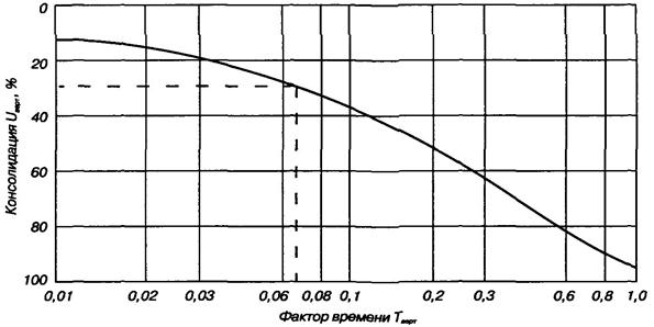Значения фактора времени N в зависимости от степени консолидации при равномерно распределенной нагрузке.