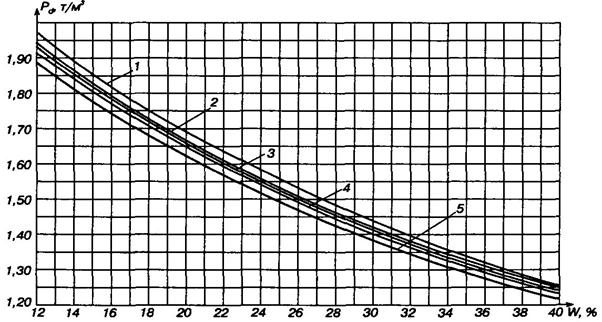 Примечание: Зависимость Рd = f(W) рассчитана при значениях плотности частиц грунтов fs, равных 2,74; 2,70; 2,68; 2,66; 2,60 т/м3 соответственно для глин, суглинков, супесей, песков, грунтов с примесью органических включений (черноземов).