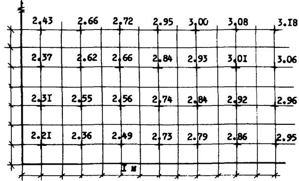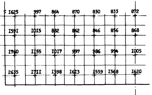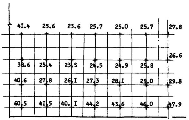 Для конкретного расчета была выбрана прямоугольная железобетонная плита размерами в плане 14×26 м толщиной 0,6 м, покоящаяся на однородном в плане свайном поле. Свайное поле состоит из железобетонных свай квадратного сечения 30×30 см длиной l = 10 м, расположенных на сетке 1,2×1,2 м. Сваи прорезает слой глинистых грунтов (V1 = 0,4) с модулем деформации Е01 = 1500 т/м2 (15 МПа) и опираются нижними концами на слой песчаных грунтов (V2 = 0,3) с модулем деформации E02 = 3000 т/м2 (30 МПа). Рассмотрен случай, когда плита передает давление и на сваи и на грунт (низкий ростверк). Нагрузки на плиту от колонн каркаса верхнего строения показаны на рис. 1. Результаты расчета показаны на рис. 2 (осадки плиты), рис. 3 (распределение давлений на свайное поле), рис. 4 (распределение коэффициентов постели основания Винклера, эквивалентного по сжимаемости свайному полю). Поскольку свайное поле однородно, а нагрузки приложены к плите симметрично относительно центральных осей плиты, то на рис. 2 ¸ 4 показана четверть плиты.