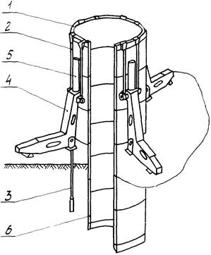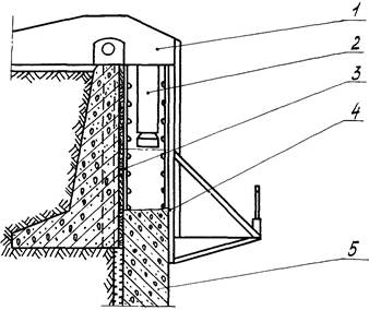 2.10. Стены колодцев могут устраиваться из монолитного железобетона (рис. 3). Бетонирование стен таких колодцев производят ярусами, используя опорную конструкцию в качестве наружной опалубки, при этом внутреннюю опалубку монтируют на подвесной полке.