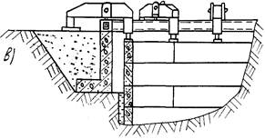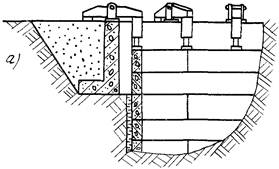 1.4. Сущность технологии строительства опускных сооружений способом задавливания (авт. свид. №№ 527515, 57182, 19662) заключается в задавливании в грунт системой гидродомкратов колодца, наращиваемого ярусами высотой, кратной величине хода штоков гидродомкратов по мере разработки и выдачи грунта. При этом погружение опускного колодца производится при обязательном опережении режущей кромкой ножа поверхности забоя.